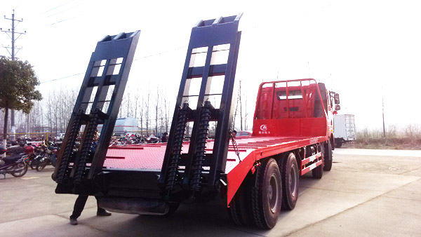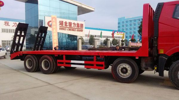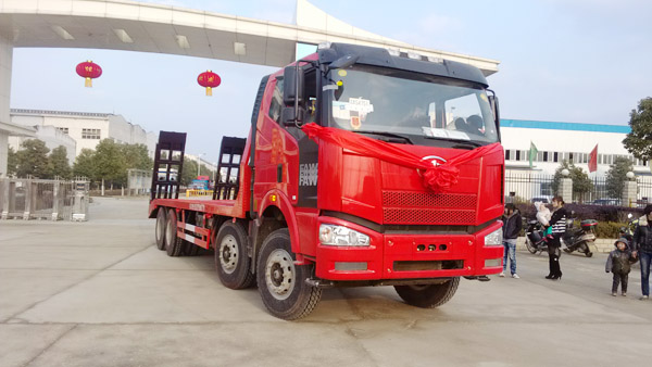 解放J6前四后八平板運輸車采用解放錫柴330EGR馬力發動機改裝,帶制動。