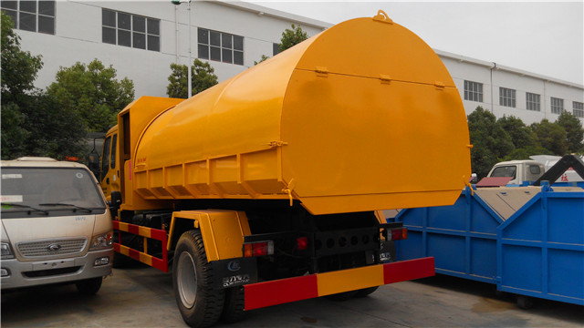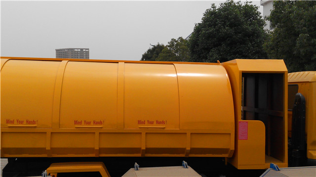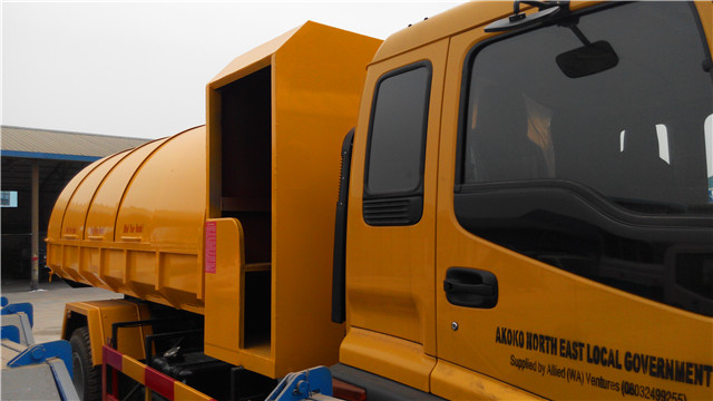 該車是尼日利亞用戶在實地考察了我廠后定購的,該車根據用戶的實際使用環境經過了特殊設計:密封垃圾箱設計成了橢圓形,便于雨水流走,另外,根據實際使用需要,在垃圾斗的前面還設計有一個乘人間,便于垃圾清運人員的乘坐。