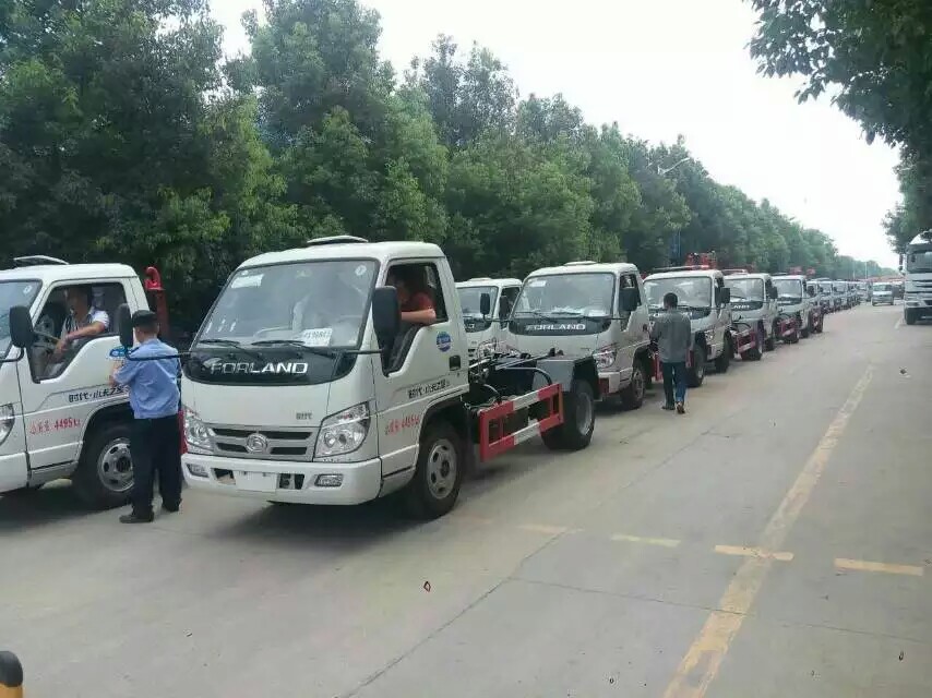 在程力廠區門口,一批福田垃圾車整齊的排成二列準備出廠,這批福田垃圾車是一用戶單位在我廠訂購的42輛福田車廂可卸式垃圾車,該車采用福田時代小卡之星3底盤改裝。國四82馬力發動機,符合國家環保需求,動力十足,1700的車身配置,前翻轉駕駛室,6.50-16輪胎,后橋5噸,承載性強,安全性高,帶動力轉向,處于行業領先地位。