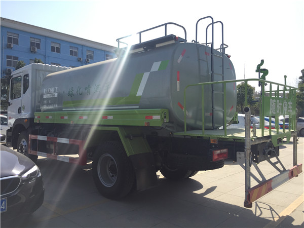 國六東風多利卡D9灑水車整車型號:CLW5162GSS4型灑水車,底盤型號:DFA1160LJ10D4,整車外形尺寸:8100,7450×2480×3000 ,罐體尺寸:5000/2100/1350mm、4350/2300/1400mm、這款國六東風多利卡D9灑水車罐體容積:12方,11.9方,不同軸距,立方數不一樣,罐體采用國標碳鋼鋼材制作,帶前噴后灑,側噴,尾部帶平臺及高炮,可以自吸自排,國六東風多利卡D9灑水車外形圖片展示如下: