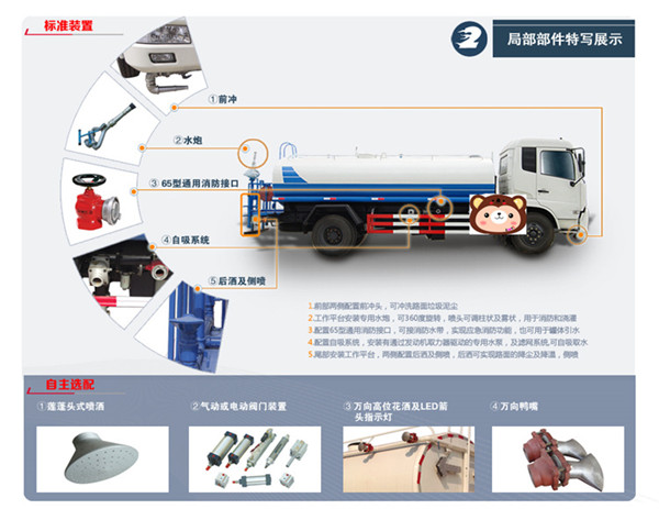 另外一種是不上牌的東風9噸灑水車,底盤采用東風單排帶翻轉駕駛室,3950軸距,900尼龍胎,帶方向助力,斷氣剎,帶暖風不帶制冷。發動機可選:玉動140馬力(5檔帶副變速),也可選康明斯170馬力(6檔帶副變速)。