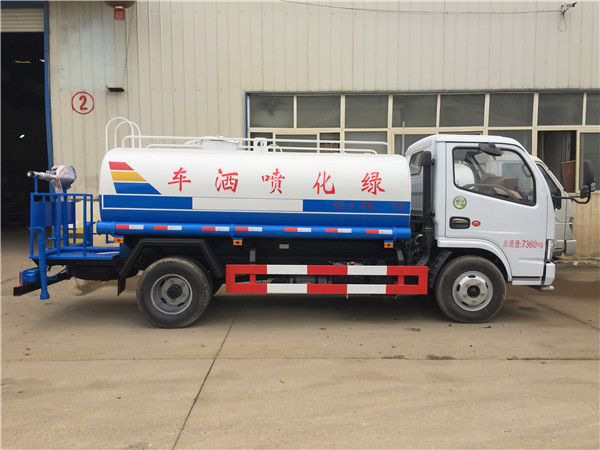 小多利卡5方灑水車(罐體容積:5立方):該車采用東風朝陽柴油發動機,一汽錫柴柴油發動機和昆明云內柴油發動機,白色前翻駕駛室,7.00-16輪胎,汽剎, 5檔變速箱,2噸前橋,4噸后橋,整車外形尺寸:長×寬×高(mm) 5990/1980/2390,總質量(kg)7360,額載質量(kg)3870。罐體有效容積:5噸,帶國家免征公告。
