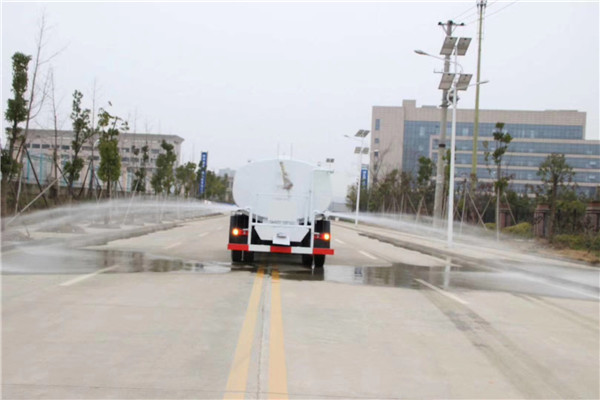 1、灑水車前沖、前噴――前沖標配的是三彎前沖噴頭,可任何調節灑水方向,常用于路面灑水,一般位于駕駛室前下方,主要噴射柱狀水流,射程14米,可將路面的垃圾及雜物沖至道路兩旁供清掃清潔,同時水遇到灰塵后結伽,防止車輛來往造成的揚塵。也可選裝前噴噴頭,即用鴨嘴噴頭替代三彎前沖,噴出的水流呈扇形,像一把水鏟一樣,可以將路面沖洗得更為干凈,但相應噴灑距離縮小,適合單邊道路的沖洗。