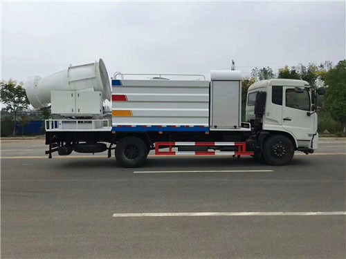東風12噸灑水車選配50米噴霧機達到除塵效果。霧炮機是根據風送原理,先使用進口高壓泵、微細霧化噴嘴將水霧化,再利用風機風量和風壓將霧化后的水霧送到較遠距離,使得水霧到達較遠距離同時能夠覆蓋更大面積,水霧與粉塵凝結后降落,從而達到降塵目的。