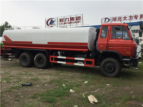 第十三款不上牌20方東風后雙橋灑水車東風153寬體駕駛室,4350+1300mm軸距,國三康機ISB210發動機,八變速箱,前橋5.0T/后橋10.0T,車架250 (7+4)mm,10.00-20尼龍胎。配置60/90水泵,前沖后灑,帶后工作平臺,帶高炮,右位花灑,帶側噴。整車型號:DLQ5250TGYL5,,底盤型號:EQ1250GLJ,平頭一排半御龍駕駛室、康明斯ISB210 50發動機、小八檔變速箱、280×80×(7+4)mm大梁、5噸前橋、10噸雙后橋,軸距4350+1300mm、輪胎11.00輪胎 ,罐體容積24立方,6mm厚,單倉帶泵、含工具箱、含兩個自流出口,水壓封頭加1000元,選裝配置(另加價):一個海底閥加1000元,一個歐標罐口加1000元