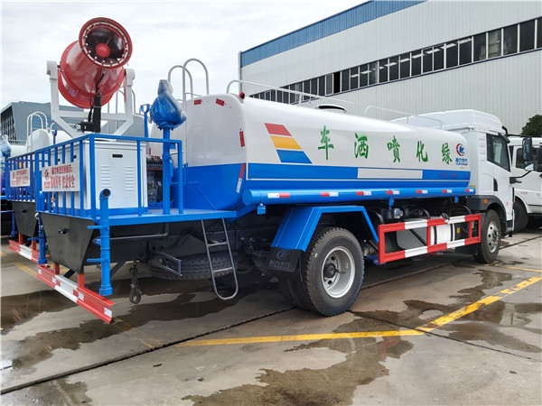 10噸解放J6灑水車整車型號:DLQ5140GSSL5,多利卡一排半車身,錫柴170馬力國六發動機,萬里揚6檔變速箱,2.7噸前橋/7.5噸后橋,3950mm軸距,220mm局部雙層車架,8.25R20輪胎,標配:中控門鎖,電動門窗,ABS。罐體容積10.4噸,前沖后灑,后工作平臺,帶高炮。