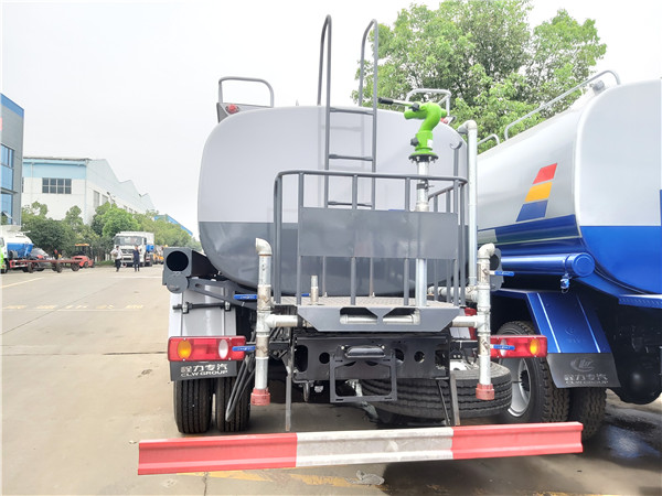 前沖(噴),后灑,帶側(cè)噴,后置工作平臺,平臺上安裝綠化灑水高壓炮(炮噴射形狀可調(diào)成直沖狀、大雨、中雨、毛毛雨、炮可360度旋轉(zhuǎn),射程>35米)。帶自流閥,消防接口。帶自吸泵,可將池塘的水直接吸入罐體內(nèi)也可直接從城市街道消防栓上連接注水,吸入罐體內(nèi)。罐前量管(觀察罐內(nèi)水位)、罐后爬梯、罐上罐口帶簡易護欄、罐側(cè)雙炮筒、6米長4寸鋼絲塑膠管兩根,灑水車罐體表面雙層油漆工藝,防銹、耐腐蝕,其余有廠家標配。可選擇加裝加裝藥盤、氣動控制閥、噴藥設(shè)備、罐內(nèi)防腐等。灑水車也可做噴藥車使用,可根椐用戶要求進專業(yè)噴藥防腐處理,也可做企業(yè)單位運水用,緊急時可做消防車使用。