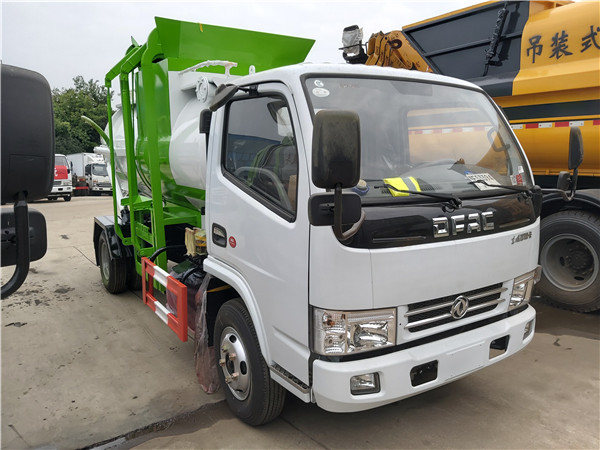 廚余垃圾車:垃圾斗固定在車身,可翻起自卸。在車廂一側有提升機,可將垃圾桶掛上自動倒入垃圾箱內。垃圾桶放在路邊或小區,隔一段距離放一個,可放240升350升的塑料桶。