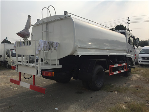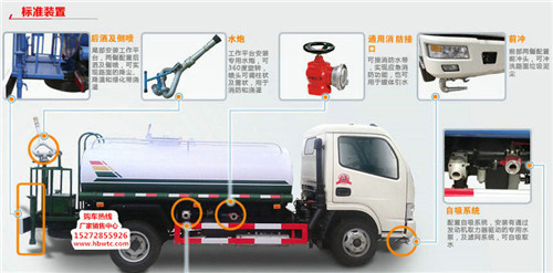 灑水車前裝有鴨嘴型噴霧或圓頭沖嘴,后面裝有圓柱形灑水砣,側噴花灑蓮花頭,車后部裝有高射噴槍。(選裝)