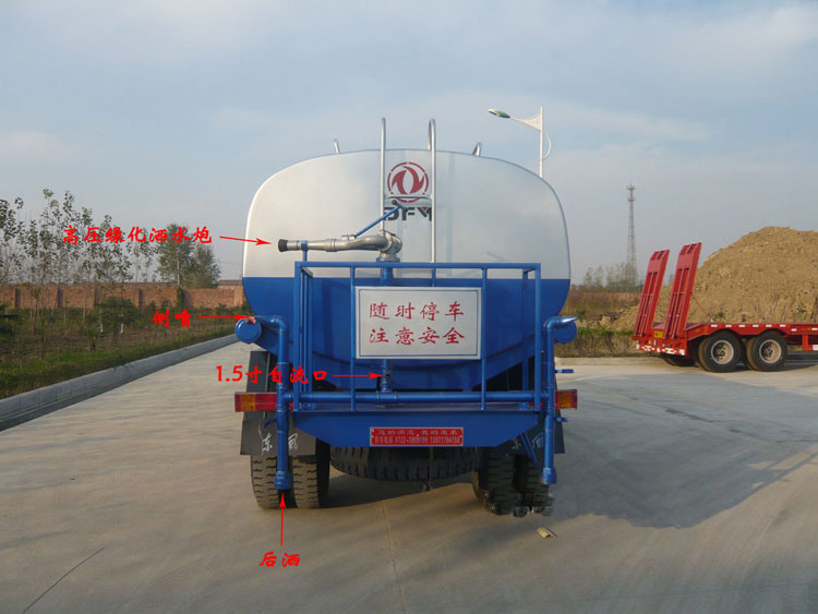 - 灑水車后灑功能:后灑一般適用于工程路面灑水,如新修的公路為防止路面干燥速度過快,造成炸裂現(xiàn)象,通常用在新修的路面上鋪設(shè)遮蓋物,并定時(shí)灑水車,以保持新路面的濕潤。