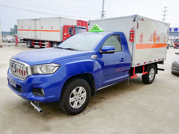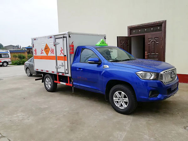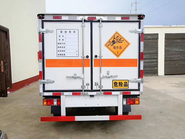 廂體全金屬整體骨架結(jié)構(gòu),外飾冷軋鋼板(隔熱,防靜電),內(nèi)飾鋁板(隔熱,防靜電),中間骨架結(jié)構(gòu)(提高廂體強度),所有箱板內(nèi)部填筑阻燃高強度泡沫板整體高壓粘合鉚接后焊接拼裝成廂型,底板鐵板上鋪設(shè)防靜電膠皮(絕緣,導(dǎo)靜電),前臉底部鋁板上加裝靜電防撞膠皮,內(nèi)飾臥環(huán)(固定貨物定位拉環(huán)),透氣孔,外部帶通風(fēng)孔,保持廂體與外部空氣流通,及時與外部空氣交換,確保安全,大梁加裝拖地靜電膠帶,把貨物摩擦靜電導(dǎo)入大地。車輛門框配備防盜報警器,廂內(nèi)頂部安裝煙霧報警器,前廂板左右立柱安放滅火器,排氣管前置安裝排氣火花熄滅器,駕駛室安裝“危險品”標(biāo)志燈,車廂外中部粘貼橙色反光帶一周,并在車廂左、右、后安裝“爆炸品”菱形牌3塊,車體后部設(shè)置安全告示牌、“危險品”黃色警示牌,后保險杠安裝緩沖加強橡膠塊等。車廂開側(cè)門,方便裝卸貨物;可加開隔倉,方便不同性質(zhì)的爆破物品同車分倉運輸。